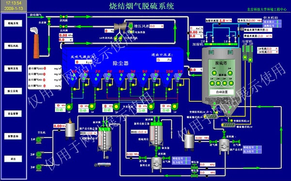 煙氣脫硫控制系統(tǒng)。該系統(tǒng)可根據(jù)企業(yè)不同煙氣溫濕度及二氧化硫氮氧化物等成分不同的實(shí)際工況,通過(guò)算法優(yōu)化控制方法,提高脫硫系統(tǒng)的自動(dòng)化程度,在保證脫硫效率的前提下,降低原材料和能源的消耗,降低脫硫系統(tǒng)的運(yùn)行成本。